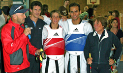 ![]() | Mit großem Interesse verfolgten die 16-fache Deutsche Meisterin, neunmalige Weltcupsiegerin, Olympiazweite und zweifache Olympiasiegerin, Rosi Mitternmaier sowie ihr Ehemann, 12-facher Deutscher Meister und sechsmaliger Weltcupsieger, Christian Neureuther, beide alpiner Skisport, zum Einen die Taekwondo-Sportdemonstration mit der am |